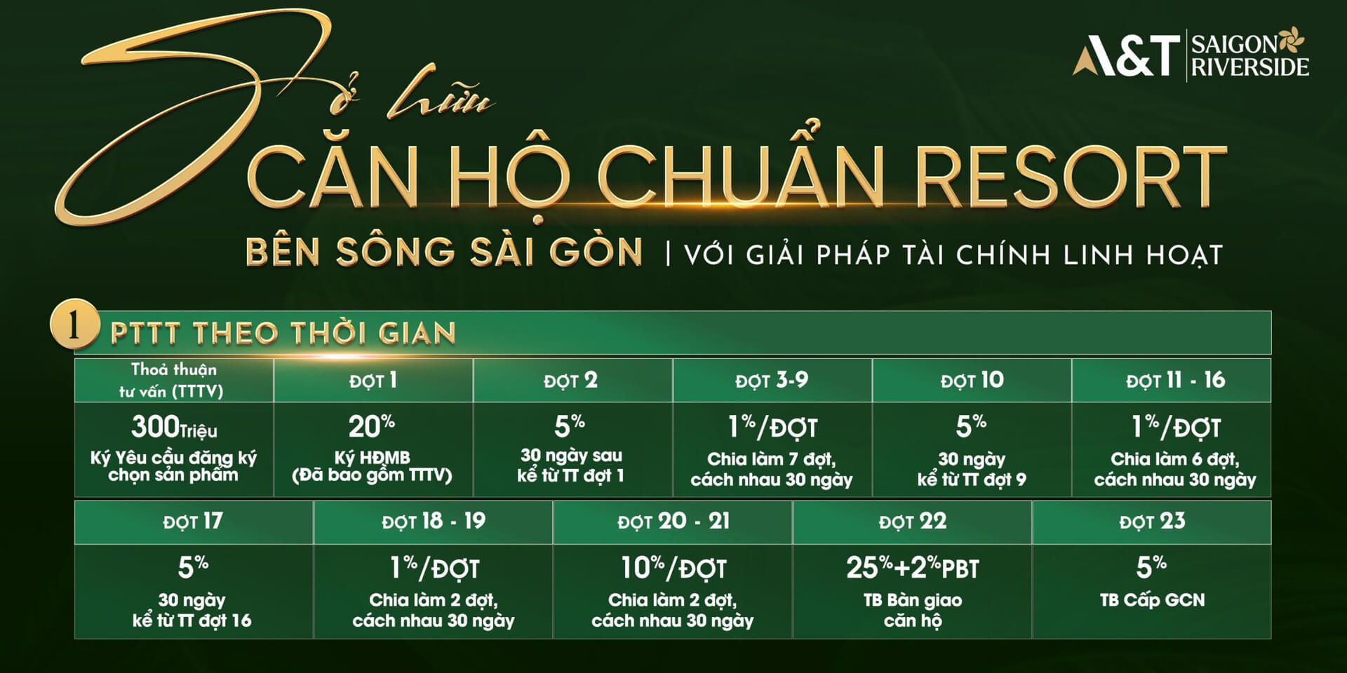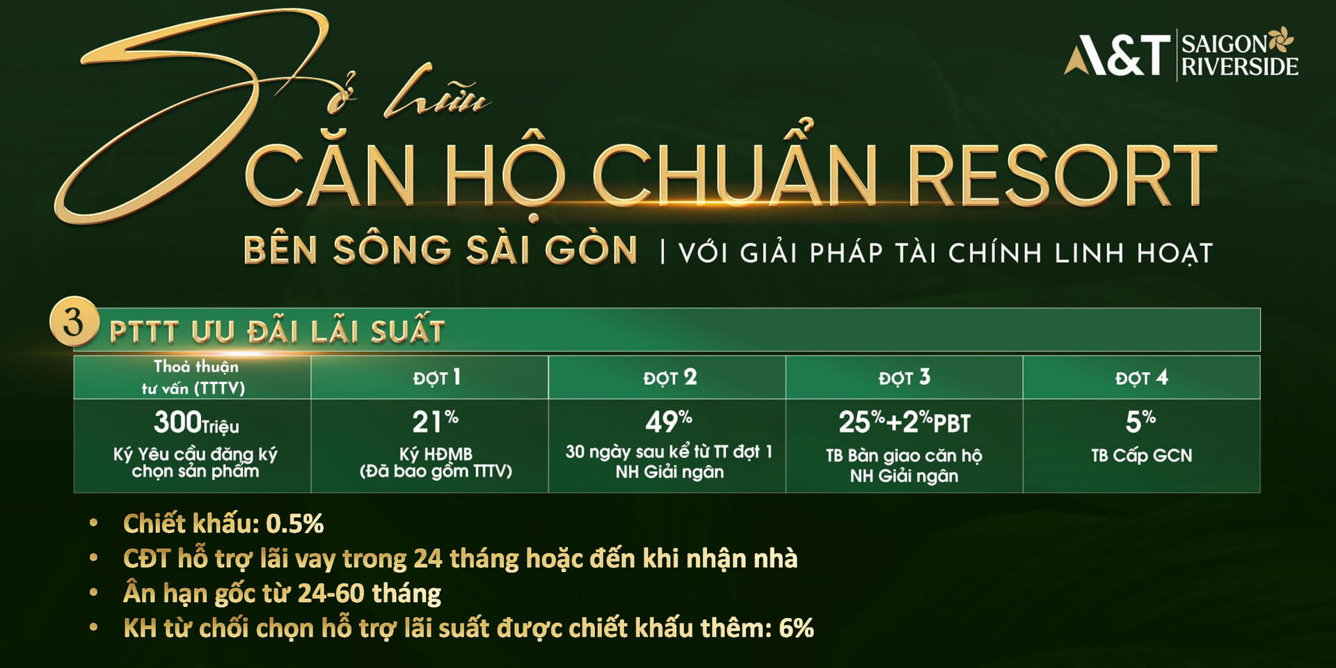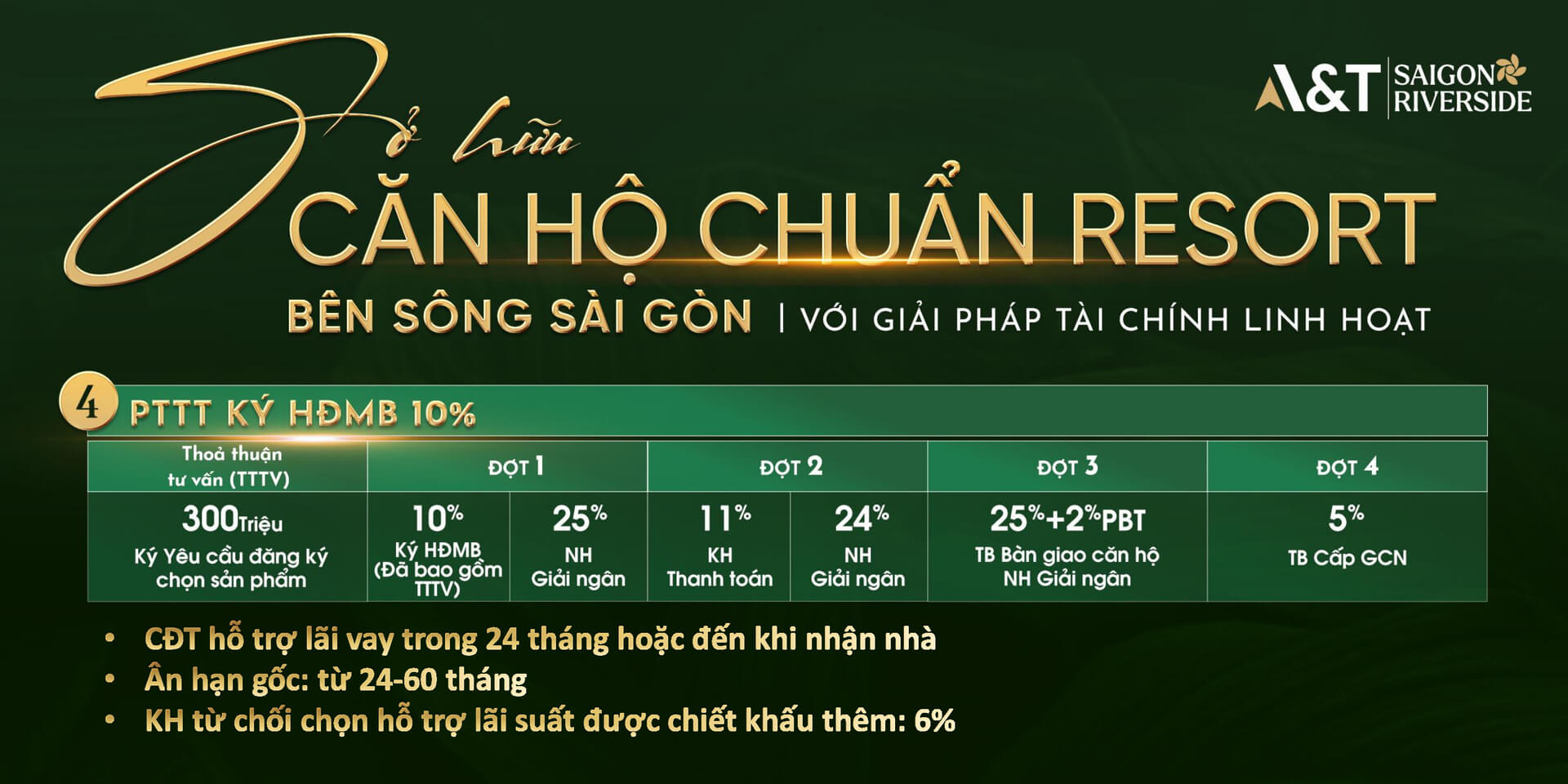 Để hiểu rõ hơn về các hình thức thanh toán cũng như chính sách vay ngân hàng. Phòng kinh doanh chủ đầu tư kiến nghị Quý khách hàng nên nghe chuyên viên tư vấn kỹ để có kế hoạch thanh toán hiệu quả nhất. Dưới đây là phương thức thanh toán của A&T Sài Gòn Riverside